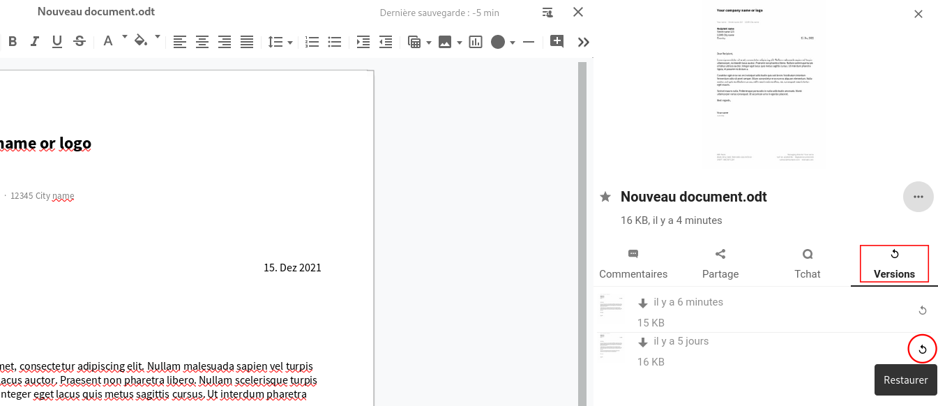 Nextcloud sauvegarde des versions successives d'un même document. Cette fonction est utile par exemple pour retrouver une copie d'un document en cas d'erreur d'édition.