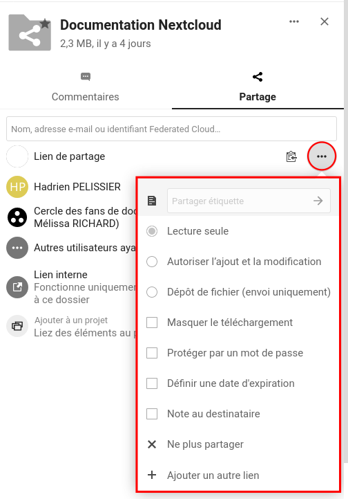 Par défaut, les destinataires d'un partage extérieur ne peuvent que lire et télécharger le document ou le dossier partagé. Il est possible de modifier ces autorisations.