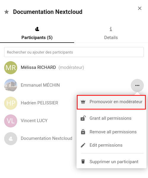 Quand vous créez une discussion de groupe, vous en êtes automatiquement modérateur⋅ice. Pour accorder ce droit aux autres membres de la discussion :
