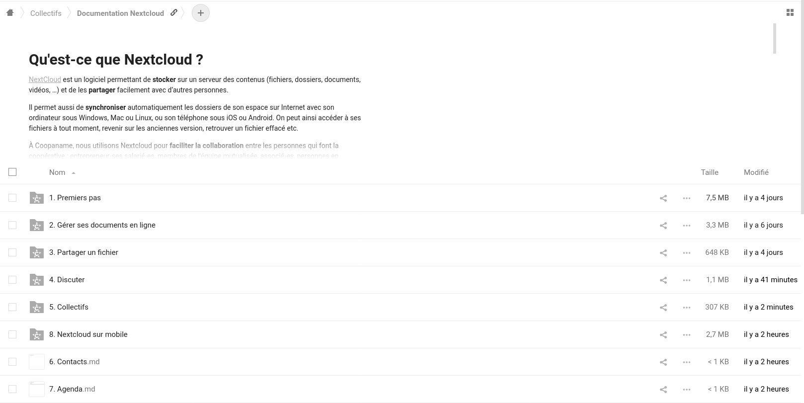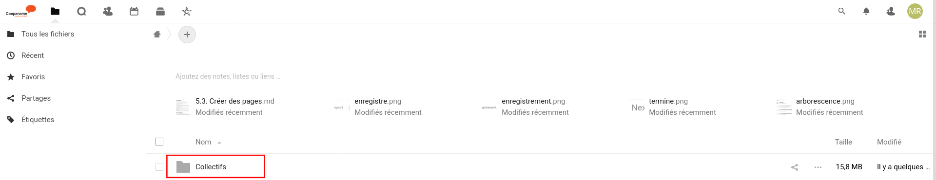L'ensemble des pages créées se retrouve dans un dossier "Collectifs" du module Fichiers, organisées en dossiers, sous-dossiers et documents texte.