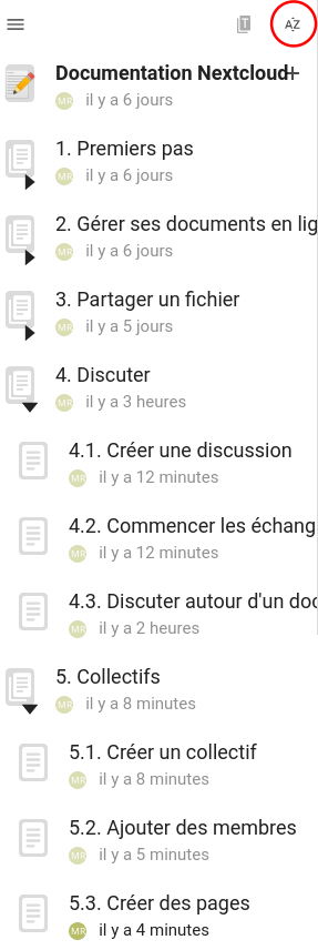 • Les pages sont organisées par date de dernière modification ou par ordre alphabétique. Pour changer l'affichage, cliquez sur le bouton en haut de l'arborescence.