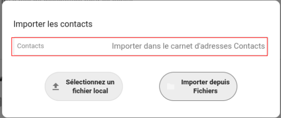 Une boîte de dialogue apparaît. Cliquez sur "Importer dans le carnet d'adresses Contacts" pour ouvrir la liste des différents carnets d'adresses (menu déroulant).