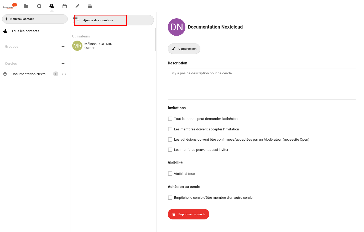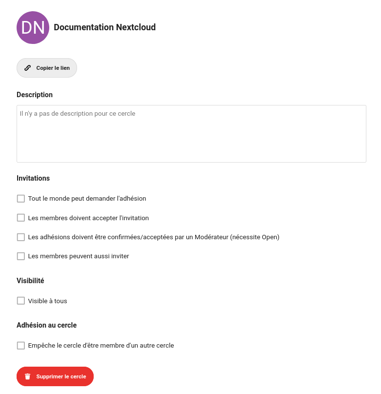 ℹ️ Dans le cas où le compte propriétaire est supprimé de Nextcloud, l'administrateur⋅ice le⋅a plus ancien⋅ne du cercle devient propriétaire.