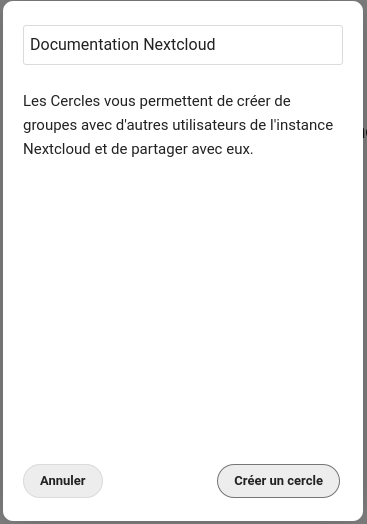 Un cercle sert à grouper des utilisateur⋅ices de votre instance Nextcloud, dans l'idée de partager un agenda, des contacts, une discussion, des notes (grâce au module Collectif), une liste de tâches (grâce au module Deck) et des fichiers. Autrement dit, à organiser du travail collectif.