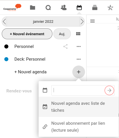 2. Entrez un nom pour votre agenda et cliquez sur la flèche à droite pour valider.