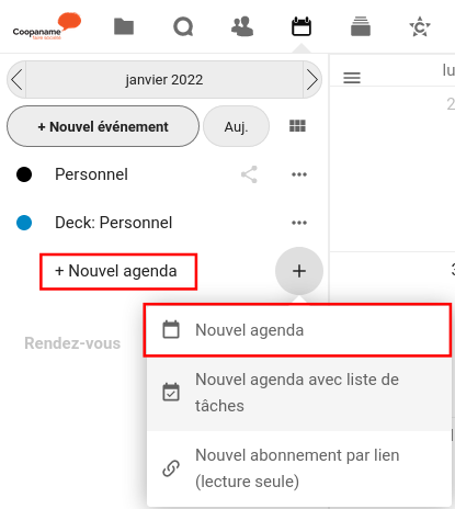 1. Cliquez sur "Nouvel agenda" dans la liste des agendas. Dans le menu déroulant, cliquez sur l'option qui vous convient :