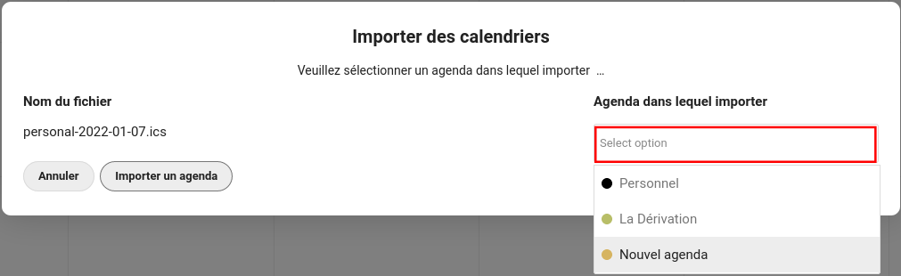 4. Dans la boîte de dialogue qui s'ouvre, cliquez sur "Select option" pour définir dans quel agenda effectuer l'import :